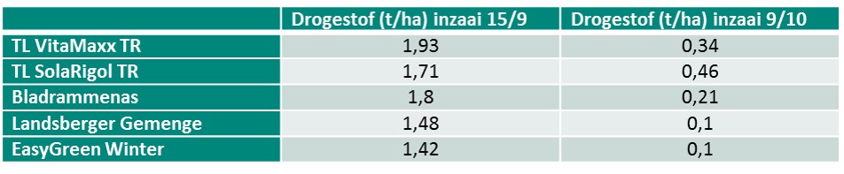 Het inzaaien van een groenbemestermengsel kan ook op 15 september prima. De opbrengsten organische stof dalen snel als er later wordt ingezaaid. Ook bij late zaai is een groenbemester gunstig voor de bodemstructuur en het actief houden van het bodemleven. De gebruikte mengsels vriezen makkelijk af en geven weinig opslag. Winterharde soorten als Italiaans raaigras en rogge zorgen voor een goede ontwikkeling in de winter. Bij laat gezaaide mengsels geven de bladrammenas en de gele mosterd het meeste biomassa.