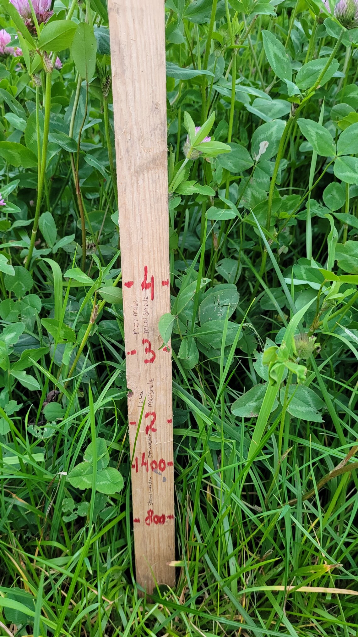 Foto rechts: De zelfgemaakte grashoogtemeter verdwijnt bijna tussen de klaver.