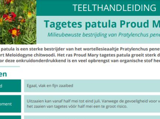 Tagetes patula Proud Mary is geen mix van Afrikaantjes die uit de ‘bloemenwereld’ stammen. Het is een veredeld hybride ras dat speciaal ontwikkeld is voor gebruik als groenbemester voor de akkerbouw en volle grond. Proud Mary is uniform en groeit in het seizoen krachtig door, waardoor deze onkruid onderdrukt en veel organische stof opbrengt. Dankzij haar rijke bloei en lange bloeiperiode is Tagetes ‘Proud Mary’ ook geliefd bij bijen, hommels, vlinders en bevordert zo de biodiversiteit. Door de relatief late bloei van Proud Mary is er weinig kans op zaadvorming in het gewas. De plant is goed mechanisch te vernietigen of in te werken en laat een gezonde bodemstructuur achter.