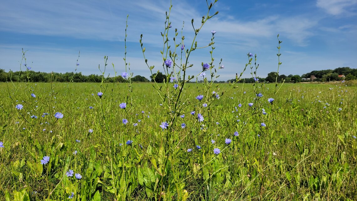 In dit voorjaar werd duidelijk dat ook de cichorei erg smakelijk is en de koeien alles voor de voet weg vraten. Op dit moment begint een deel van de cichoreiplanten door te schieten en komen de blauwe bloempjes tevoorschijn.