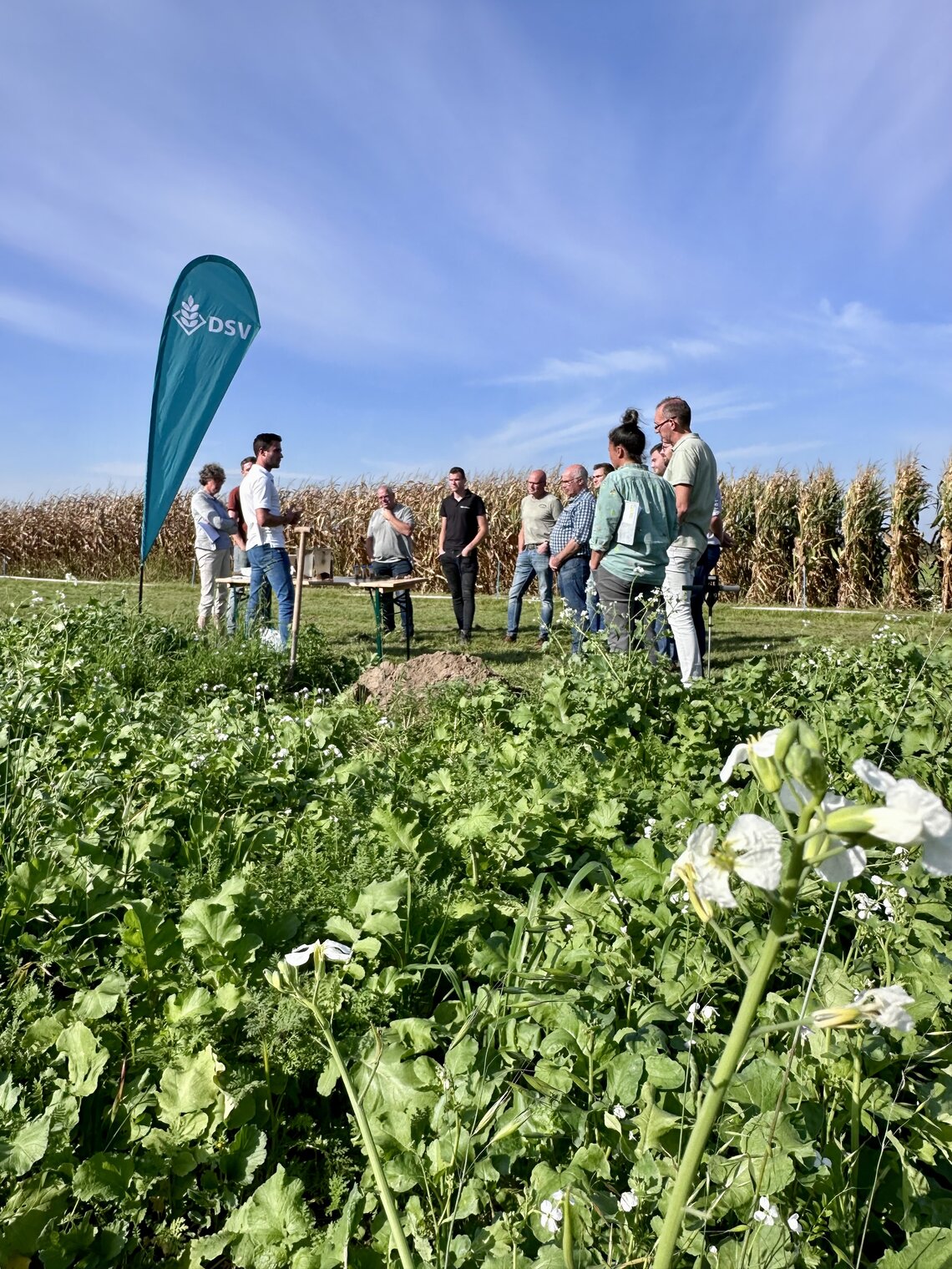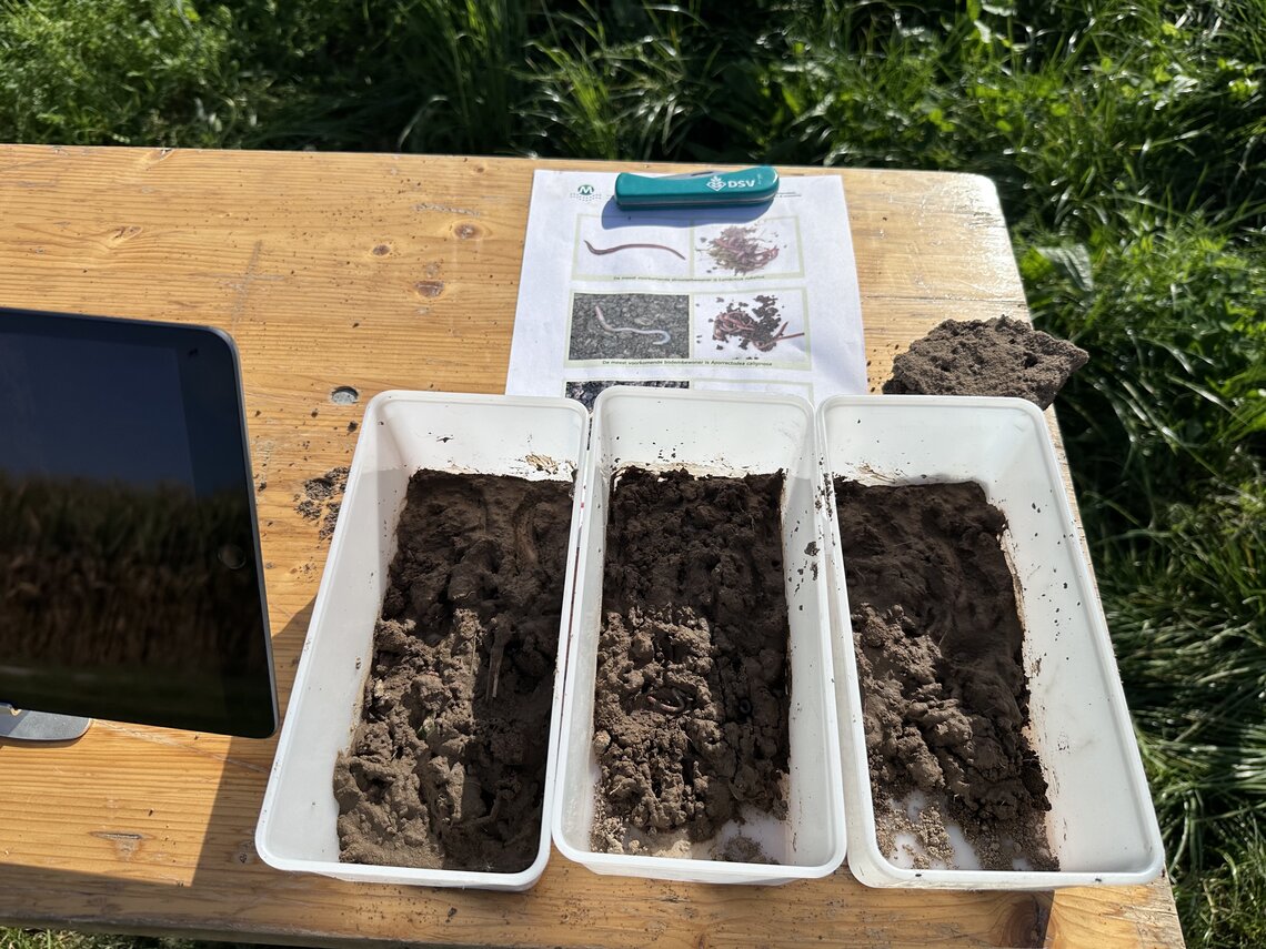 Op de demovelden volgden workshops die meer informatie uit de praktijk lieten zien. Karst Brolsma van Eurofins Agro liet in een profielkuil door middel van een praktische analyse zien welke organismen er in de bodem leven en hoe je het microbioom kan meten. Dit kan door middel van de Bodemlevenmonitor. Daarbij had hij eerder bodemmonsters genomen van de diverse demovelden van DSV zaden van groenbemestermengsels, sorghum en soortenrijk grasland. Hij legde de uitkomsten van deze metingen uit over het gemiddelde organische stof, microbiële massa, biomassa en schimmel-/bacterieratio.