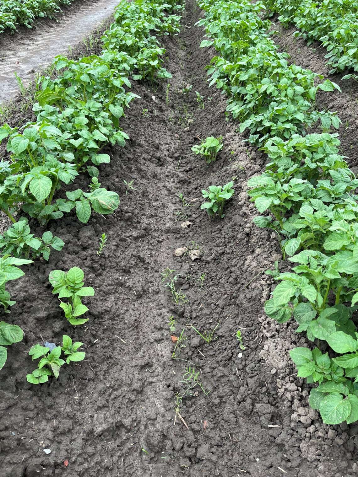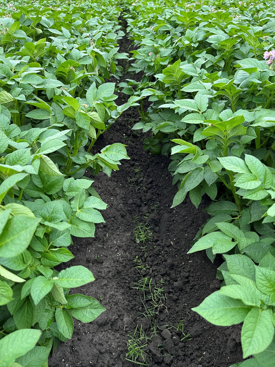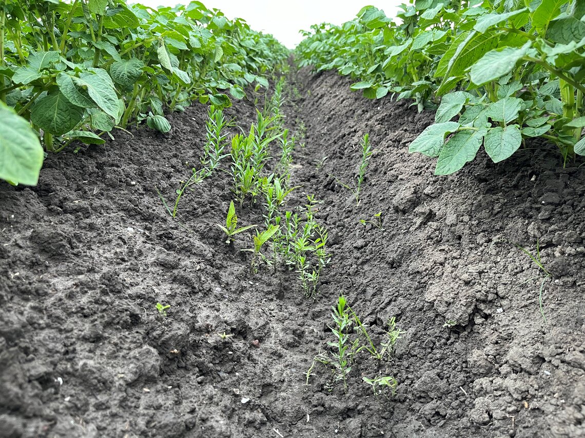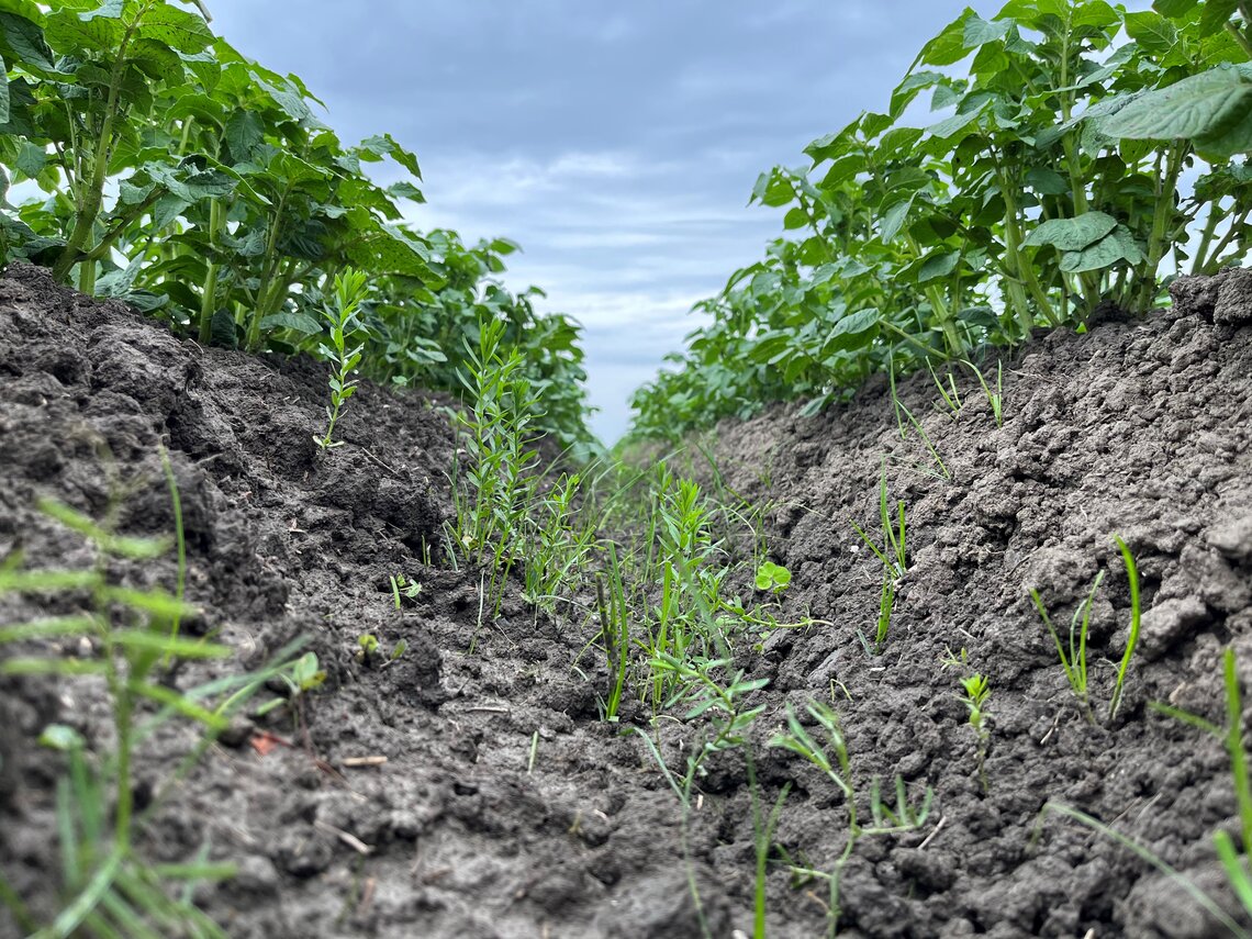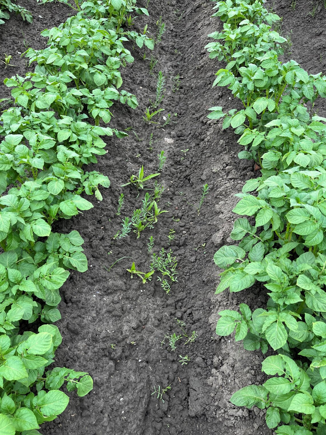 Nicole Bil over de eerste resultaten: ‘Ik sta ervan te kijken dat, zoals het nu lijkt, alle soorten gekiemd zijn van het mengsel na de bespuiting. Verder valt op dat vanaf de opkomst de verdeling over de rug vooral bij de toepassing vóór het frezen heel mooi is. Tot ca. 2 weken geleden vond ik dat de mooiste veldjes. Echter daarna gingen ze concurreren met de aardappelen. Het lijkt erop dat de aardappelen er wel overheen groeien, maar vooral bij de Solanum Pro lijkt de niger behoorlijk te concurreren, dit is wellicht een te forse plant voor de onderzaai.’