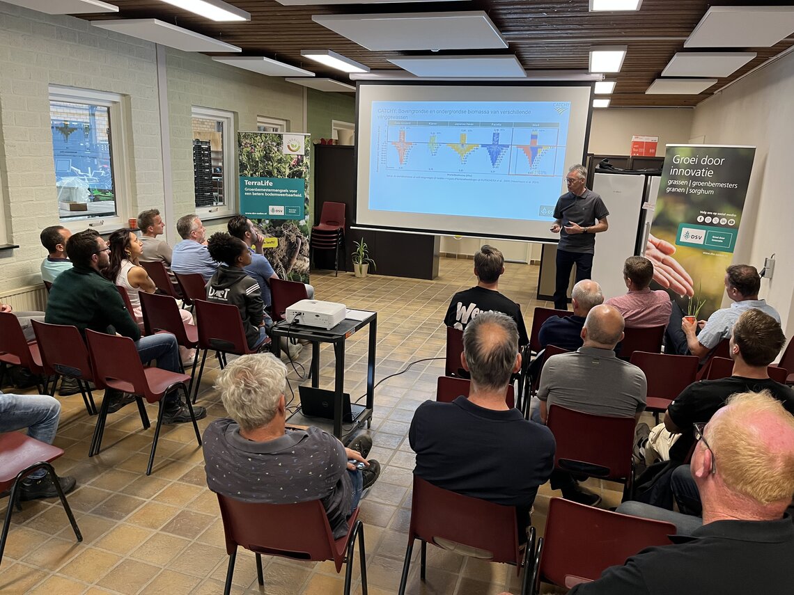 Tijdens het eerste deel van de bijeenkomst lichtte Jos Deckers het belang van een veerkachtige bodem toe die beter om kan gaan met klimaatextremen. Daarbij deelde hij veel diepgaande en technische kennis uit het 9-jarig CATCHY-onderzoek, waarbij een soortenrijk TerraLife-mengsel de beste verbetering in de bodemstructuur liet zien.