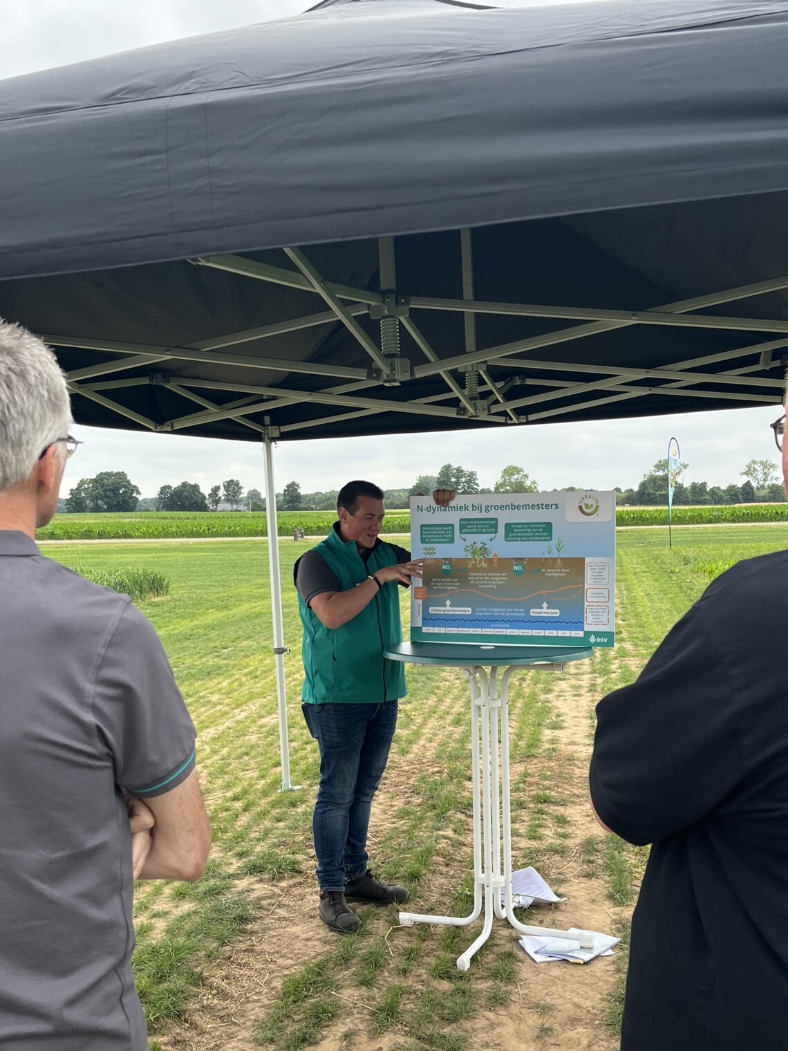 Rowan Timmer lichtte het onderwerp N-dynamiek van de groenbemesters toe, en de impact van een groenbemester op de bodem en de hoofdteelt. Mengsels met een aandeel vlinderbloemigen kunnen extra N vastleggen, hebben een lagere C/N verhouding en verteren sneller.