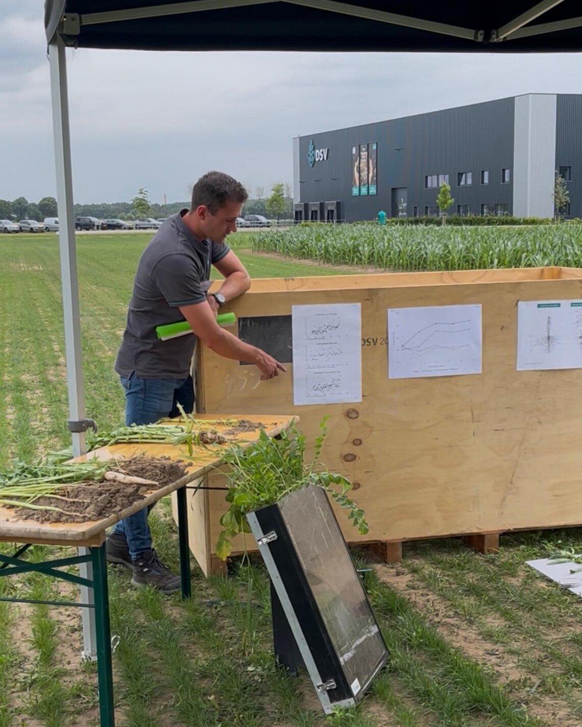 Jerry van Gremberghe legt tijdens zijn presentatie de DSV innovaties in companion cropping uit. Companion Cropping is een teeltmethode waarbij verschillende gewassen strategisch gecombineerd worden en gelijktijdig naast of door elkaar worden geteeld. De door DSV nieuw ontwikkelde mengsels TerraLife ZeaPro en TerraLife CerealPro werden hiermee ook geïntroduceerd.